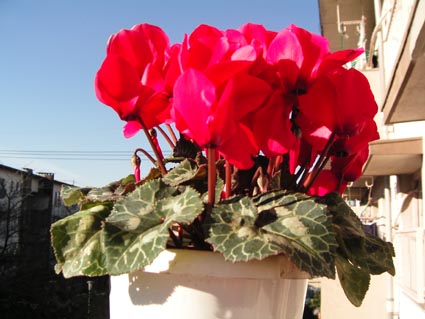 晴れ。ベランダのわび助(白)が2輪一番咲きだ、青空の下でカメラに収める。ついでに先日買ったシクラメンも写して置く。着替えて体操に出る。年末だからと念入りに風呂掃除をしていてへりで胸を打ったから今日は休むと梅さんからテレ有り、お大事に。栄ちゃんはCDRの書き込みソフト「トースト」を買いに秋葉原へ出かけた。バンドル品を使っていたが限界のようです。ま、結構いい遊び場なんです。午後ダウンのロングコートが半額になったので買いに行く、初日の今日はサイズも豊富、待っていて良かった。私の雪柳が緑の中に赤(紅葉)が入りおまけに花まで咲いている、折って玄関に活ける。それほど寒くない一日でしたが北の方は雪のようでした。