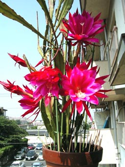 晴れ、午後から崩れるらしいが洗濯をする。ベランダの花が3ついっぺんに咲いた。昨日咲いた花はしおれたが周りで3つ咲いた、嬉しくなってまたデジカメで取る。1枚プリントして株を呉れた人にはがきを出す。結局この株は9輪の花が咲くことになる。午後獨協大学で開催されている国際村一番地のフェスチバルを見に行く、新しい建物の中でにぎやかに開かれていた。渡辺さんにもすぐに会えたし、たくさんの人にも会えて良かった、ご苦労様でした。今日も汗びっしょり、扇風機も出したが、もうクーラーもかけた。今年一番の夏日でした。