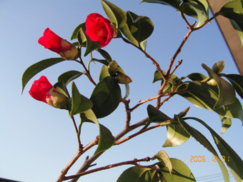 晴れ、洗濯をする。正裕は智美達と年越しそばを食べに行った。お昼は栄ちゃんと蕎麦です。鉢植えの一番咲きは赤の侘び助、青い空をバックに写す。