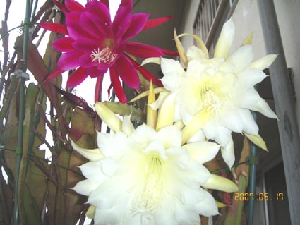 雨、予報どうりです。紅孔雀が昨夜咲きました、気温が低いのでおとといの月下美人も未だ頑張っているので一緒に撮影しました。栄ちゃんは体調が思わしくないようで今日も寝ているそうです、やはり旅行が応えたか、ですね。私は文化協会の評議委員会に出る。市長からメールを頂いて返事を出す。明日はV連の総会です。