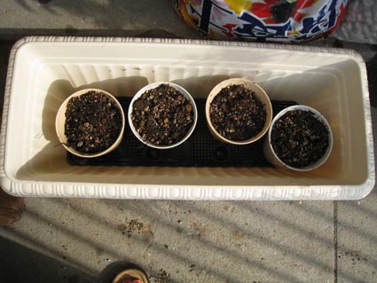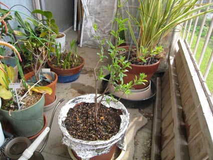 晴れ。アーモンドの種を植える、小さな小鉢を4個用意した。葉の出た鉢も大きくした。