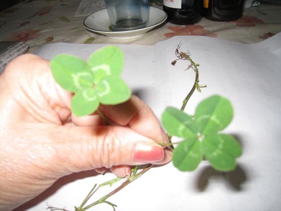 予報では雨のようですが、朝はまだ降っていないので洗濯をしちゃいました。正裕からのメールで新しいテレパソを買ったと言ってきた、いよいよデジタル対応です。午前中はプールです、相変わらず歩く人が多くて、久しぶりなので早めに出る。買い物をして帰宅。お昼の後眼鏡のチェーンを壊したというが、めがねそのものがひん曲がっている。栄ちゃんを連れて眼鏡屋さんへ、なおしてもらってチェーンをかって帰宅。注文したファンケルが昨日届いているのでローソンで支払い、何気なく見ていたら四つ葉のクローバを二つもみっけ、根っこごと持ち帰ってカメラに納めたあと空いている鉢に植えてみた、いつの日かの楽しみです。