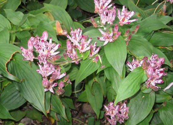 上は満開のホトトギス。下は画面中央の花の横でホバリングする雀蛾です。